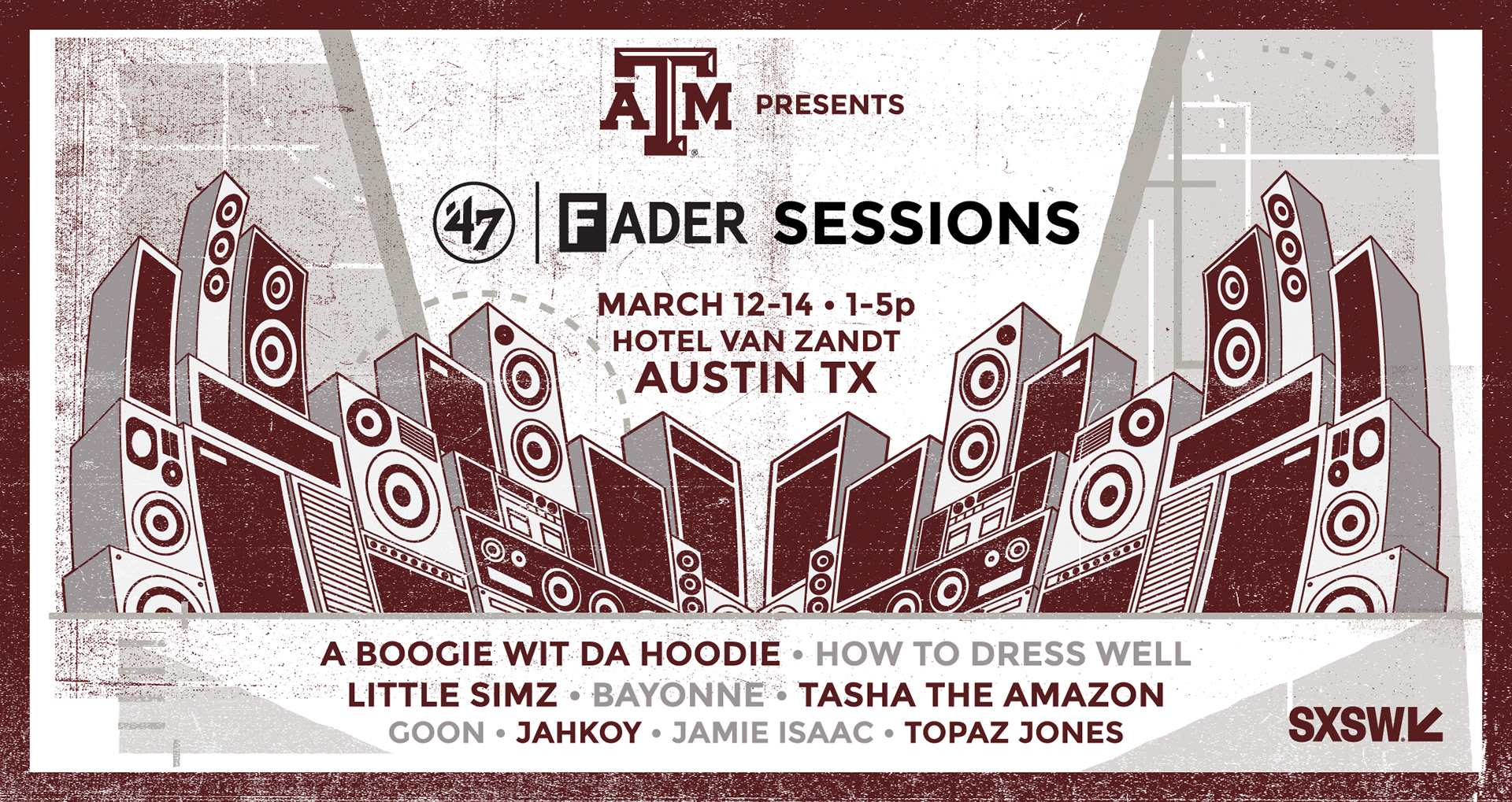 For three decades, the annual SXSW Festival has been rooted in discovery and innovation – be it new technologies, music, art, films, brands, burritos and beyond. ’47 joined Texas A&M University, a top international institution, in their activation that keeps this theme alive during the 2017 SXSW Interactive Conference. It wouldn’t be SXSW –– or Austin, Texas –– without ample live music and culture, so ’47 was thrilled to help inject these elements into the Texas A&M House, as the University’s sports lifestyle partner. In their takeover of the eclectic Hotel Van Zandt off Rainey Street, Texas A&M hosted the ’47 x FADER Sessions – a showcase of seminal music talent from a range of genres. By tapping into The FADER gurus, we were able to curate groundbreaking, discoverable new artists in the space, who performed live sets in front of a science-experiment-like backdrop.