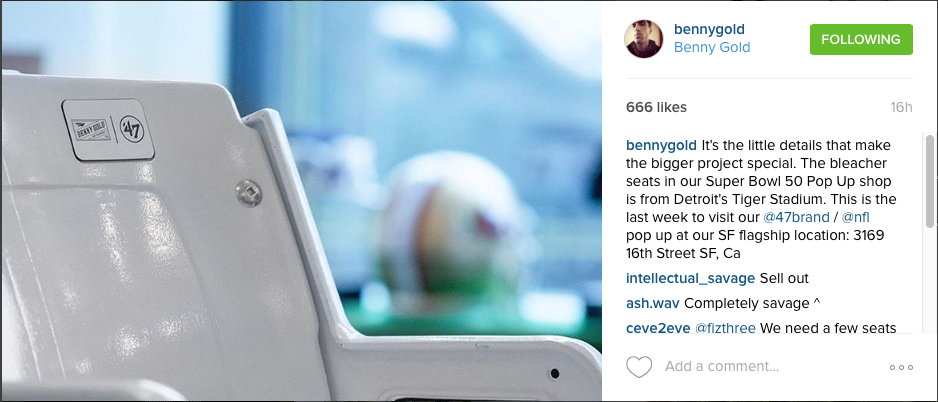To commemorate Super Bowl 50 in San Francisco, Boston's sports lifestyle brand ’47 partnered with two of the Bay Area’s premier streetwear imprints to create a one-of-a-kind capsule collection. Enlisting Benny Gold and Black Scale, the SB50 Boutique Collection captures the same energy of the event while paying homage to the host city with a bevy of casual stables, from headwear to hoodies. SB50 has two distinct stories as told through the lens of the respective partners. While Benny Gold remains consistent with its “stay gold” mantra, Black Scale’s approach to the collaboration is synonymous with its hallmark tonal black-and-white color palette. The collection will be available to fans everywhere via 47brand.com, bennygold.com and black-scale.com. My task was to create a unique pop-up shop within Benny Gold and Black Scale's flagship stores in San Francisco. The idea was to take elements of sport and infuse them in a functional way into the space. We created custom logos and signage from chain link fence, built and installed custom lockers with paint schemes that work within the tone of the individual shop, and even sourced and refinished stadium seats from the old Tiger Stadium in Detroit. In the end, each shop had a one of a kind retail experience which called out the collection, while highlighting each brand's personality.